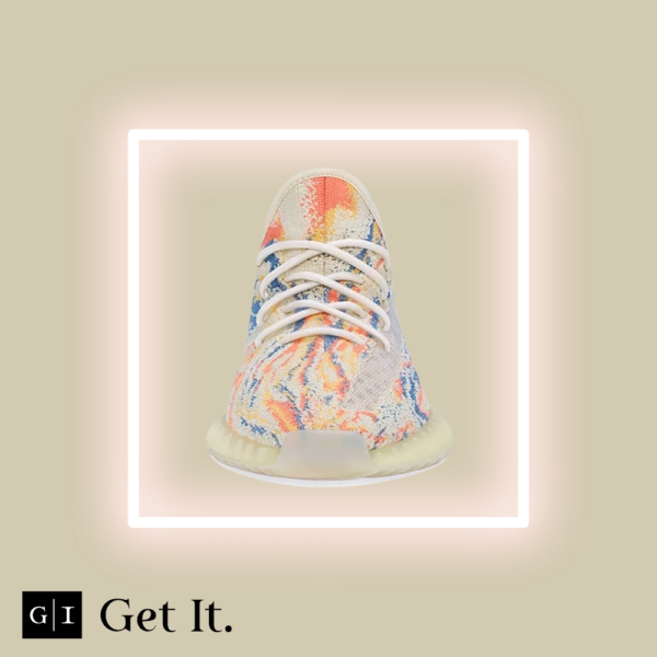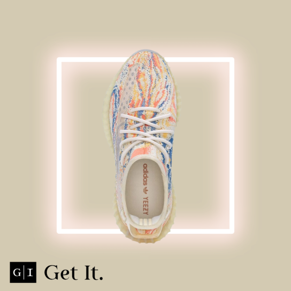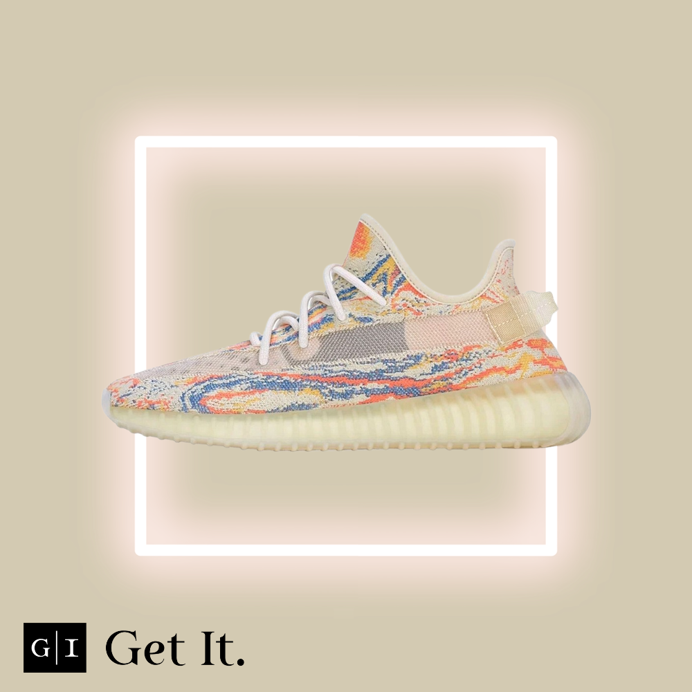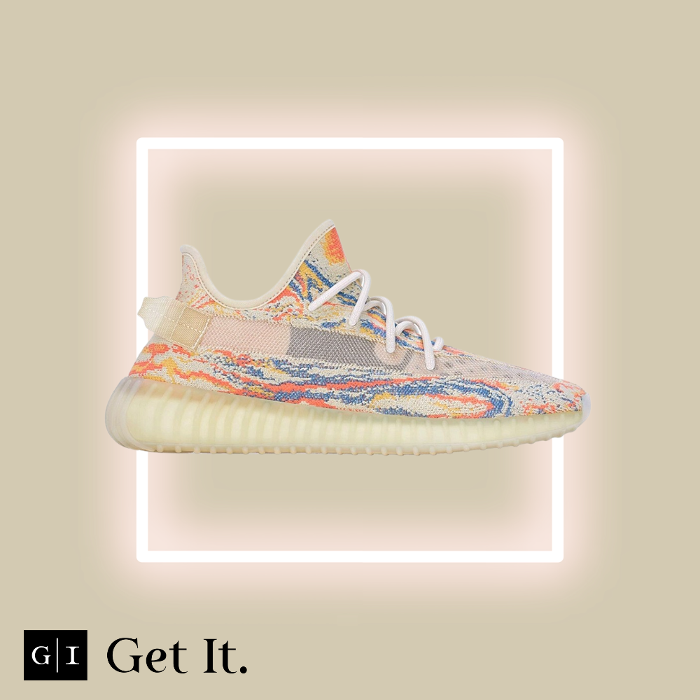 The Adidas Yeezy Boost 350 V2 MX Oat features a yellow, orange, and blue swirl-patterned Primeknit upper with a mesh side stripe and yellow heel tab. From there, a semi-translucent Boost midsole and pale yellow rope laces complete the design.