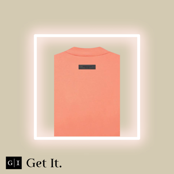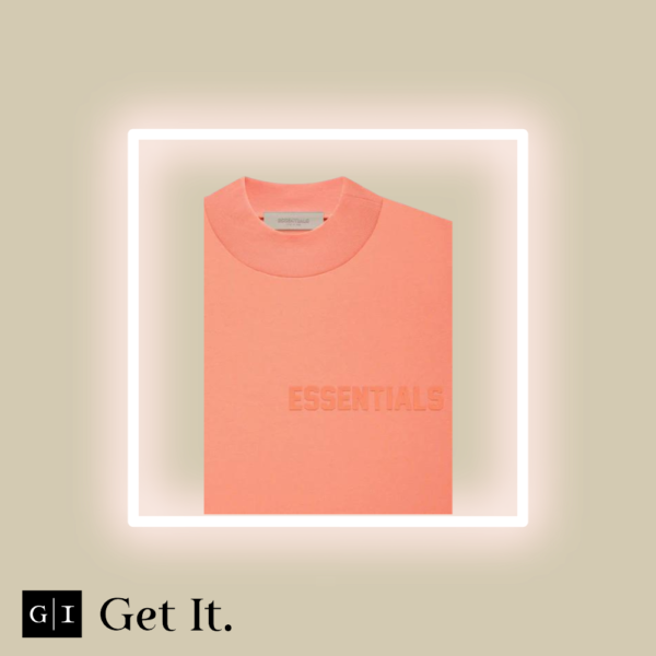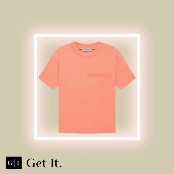 The Essentials Fear Of God Coral T-Shirt features short sleeves, a classic crew neckline, a FOG logo graphic on the front, and a rubber brand logo at the upper back.