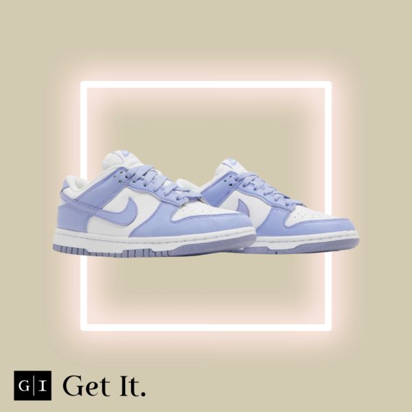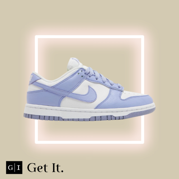 This Nike women’s Dunk two-tone colour combination seemingly inspired by spring. “White” leather sets the stage for a compelling “Lilac” hue that animates overlays around the toe, along the tongue and across the heel. “NIKE” and swoosh branding on the tongue label and profiles, respectively, also indulge in the light purple tone, further expanding the dunk’s iconic roster of styles.